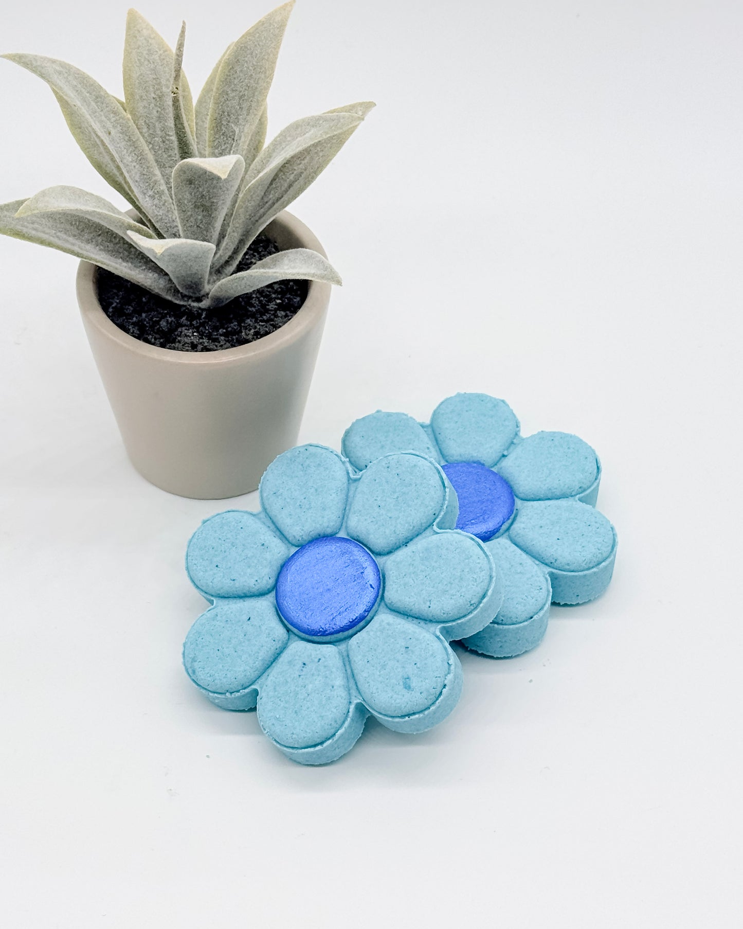 Blue flower-shaped shower bombs with dark blue centers with a potted plant on a white background
